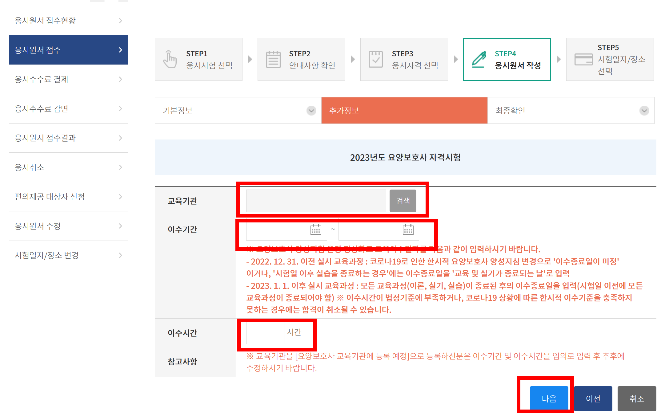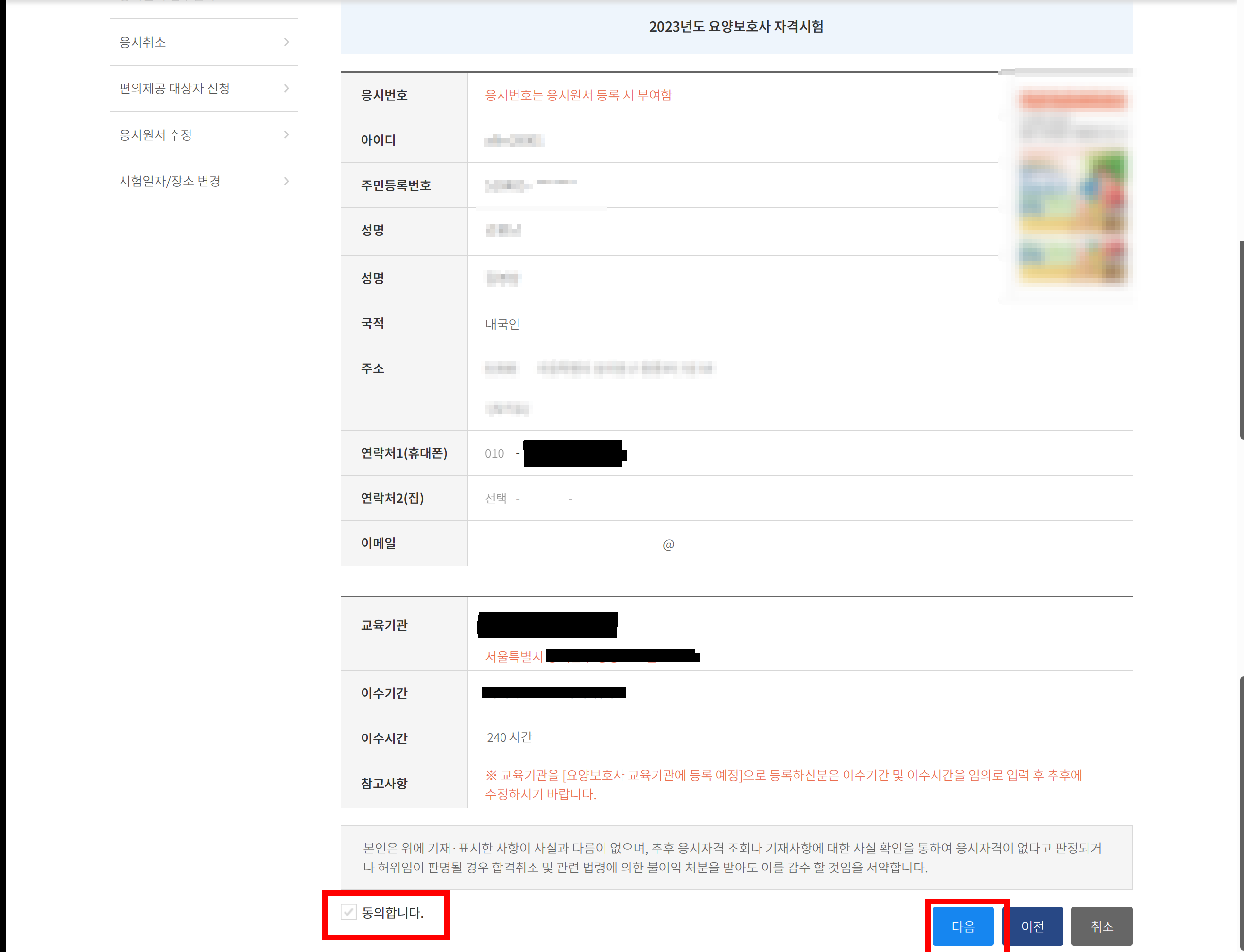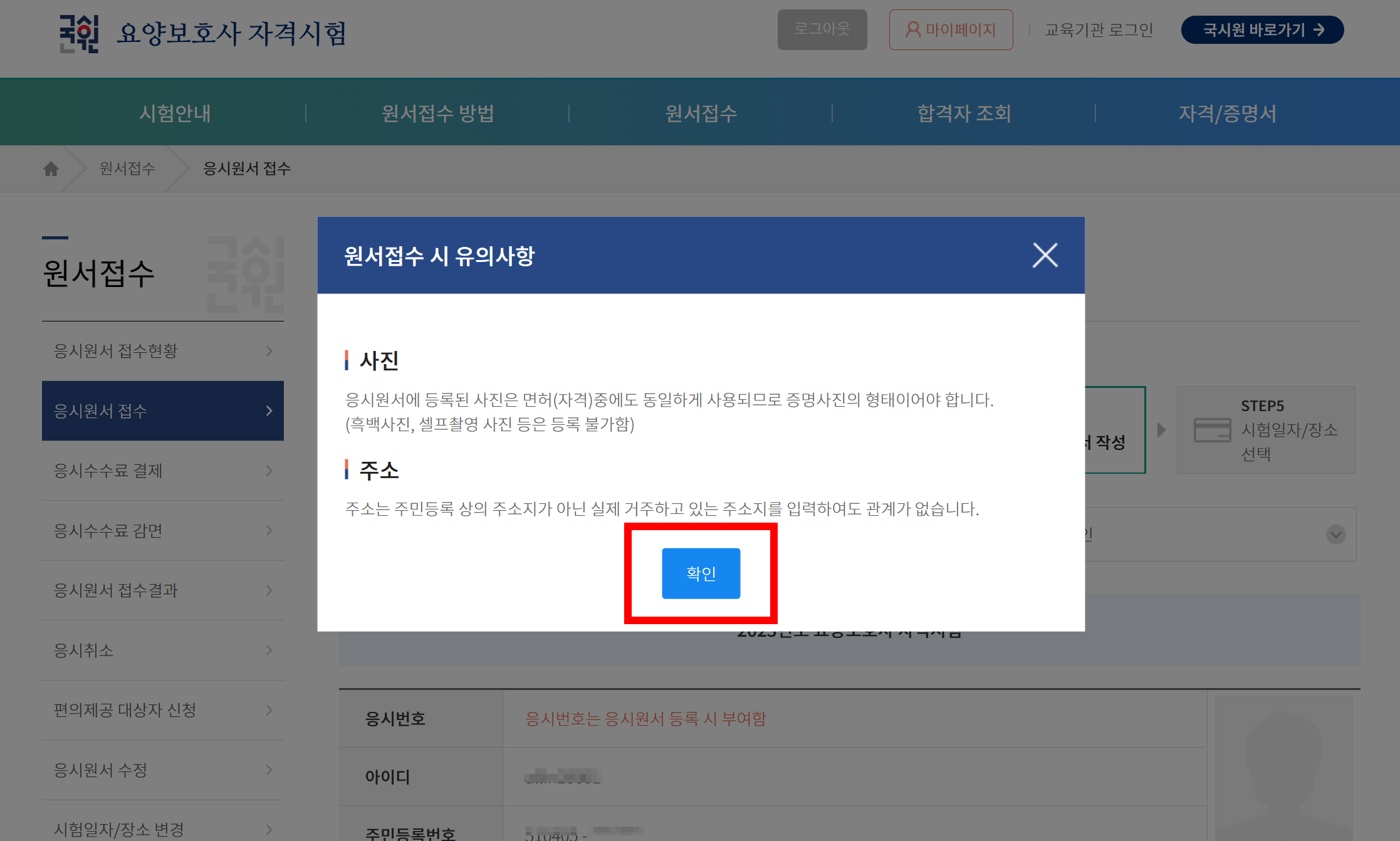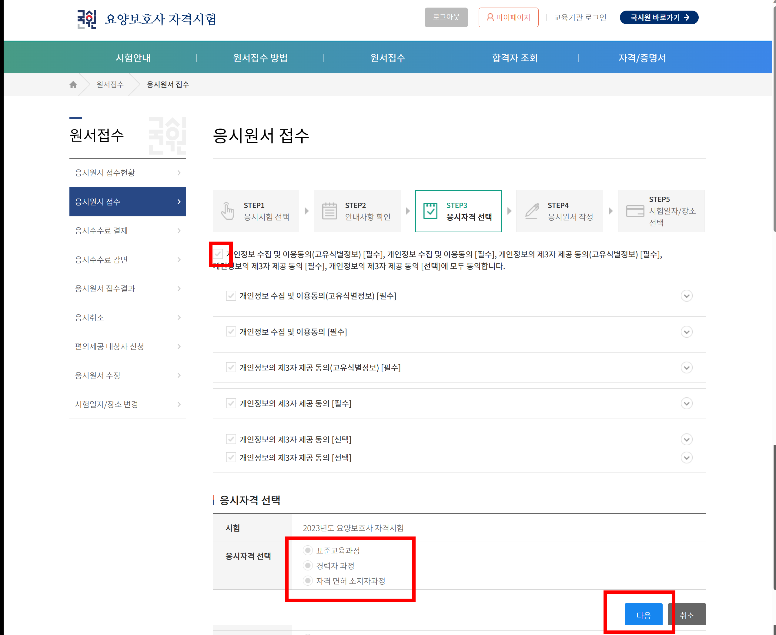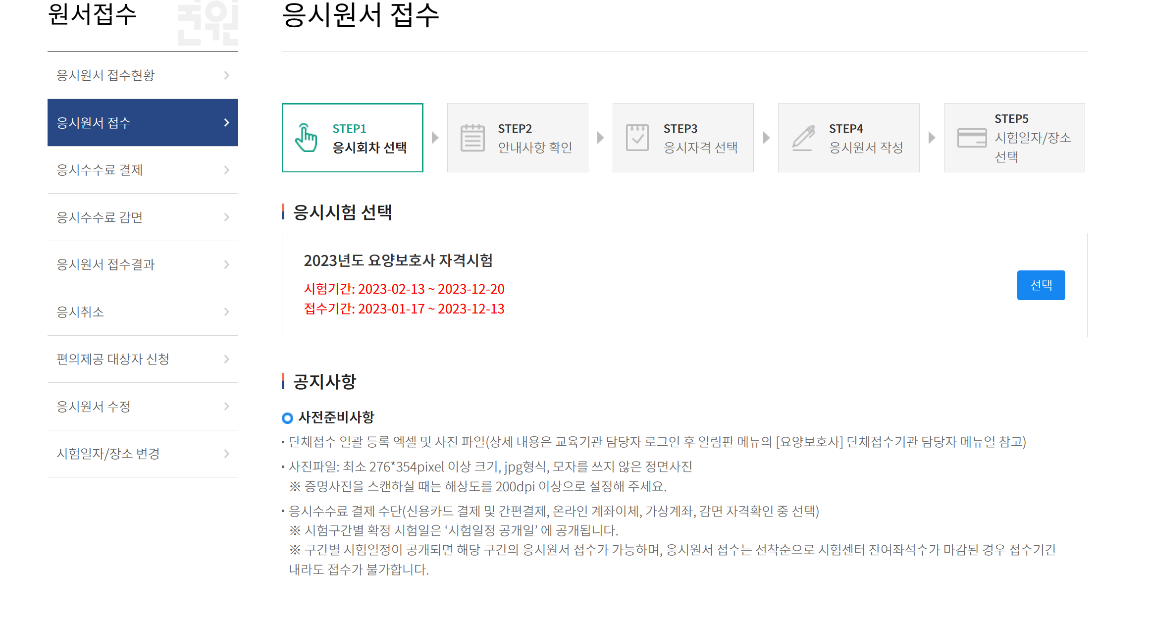 2023년도 요양보호사 자격시험 옆 선택 버튼 누르시고