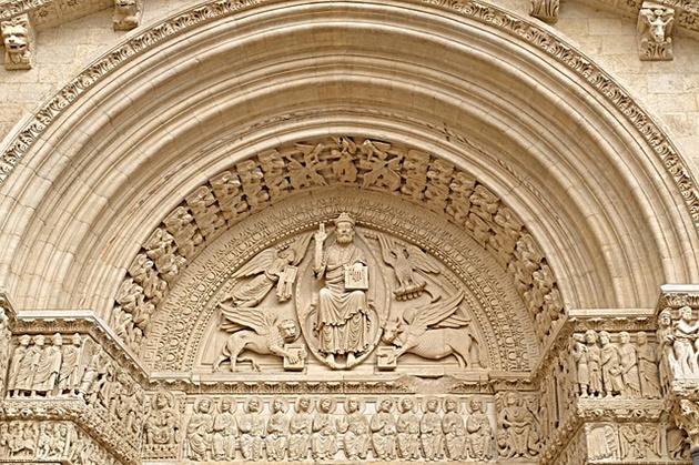 로마네스크 성당의 외부는 정문 주위의 부조 조각을 빼고 소박한 느낌을 준다. 당시 신자들은 대부분 문맹이었기 때문에 석조판에 교리를 의미하는 조각을 새겨 넣어서 신자들에게 교리를 전파할 수 있었다고 전해진다. 이러한 조각들은 원주나 버팀 기둥의 맨 윗부분인 주두에 자리 잡았다. 그러나 가장 주목을 끄는 것은 정문의 상인방 위, 아치 아래의 반원형 공간인 팀파눔(Tympanum)에 집중된 조각들이기도 하다. 여기에는 천국의 왕관을 쓰고 승천하는 그리스도와 죄인의 영혼을 게걸스럽게 먹고 있는 요괴들과 악마가 죄인의 육식을 꼬챙이로 꿰고 있는 최후의 심판 장면 등 주로 신약 구약의 교훈적인 장면이 새겨져 있다. 15세기에 인쇄술이 발명될 때까지 이 수사본은 종교적인 가르침뿐만 아니 고전 문학을 기록한 유일한 형태라고 알려있다. 로마네스크는 수평적이고 원통형 궁륭에서 볼 수 있는 둥근 아치로 되어있다.