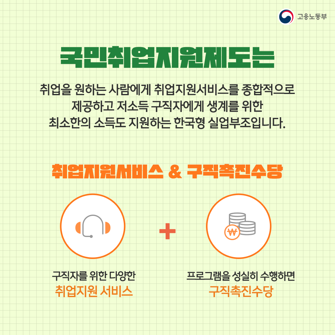 저소득 구직자, 청년 실업자, 경력단절여성 등 취업취약계층을 대상으로 취업지원서비스와 생계지원을 함께 제공하는 고용노동부 '한국형 실업부조' 제도입니다.
