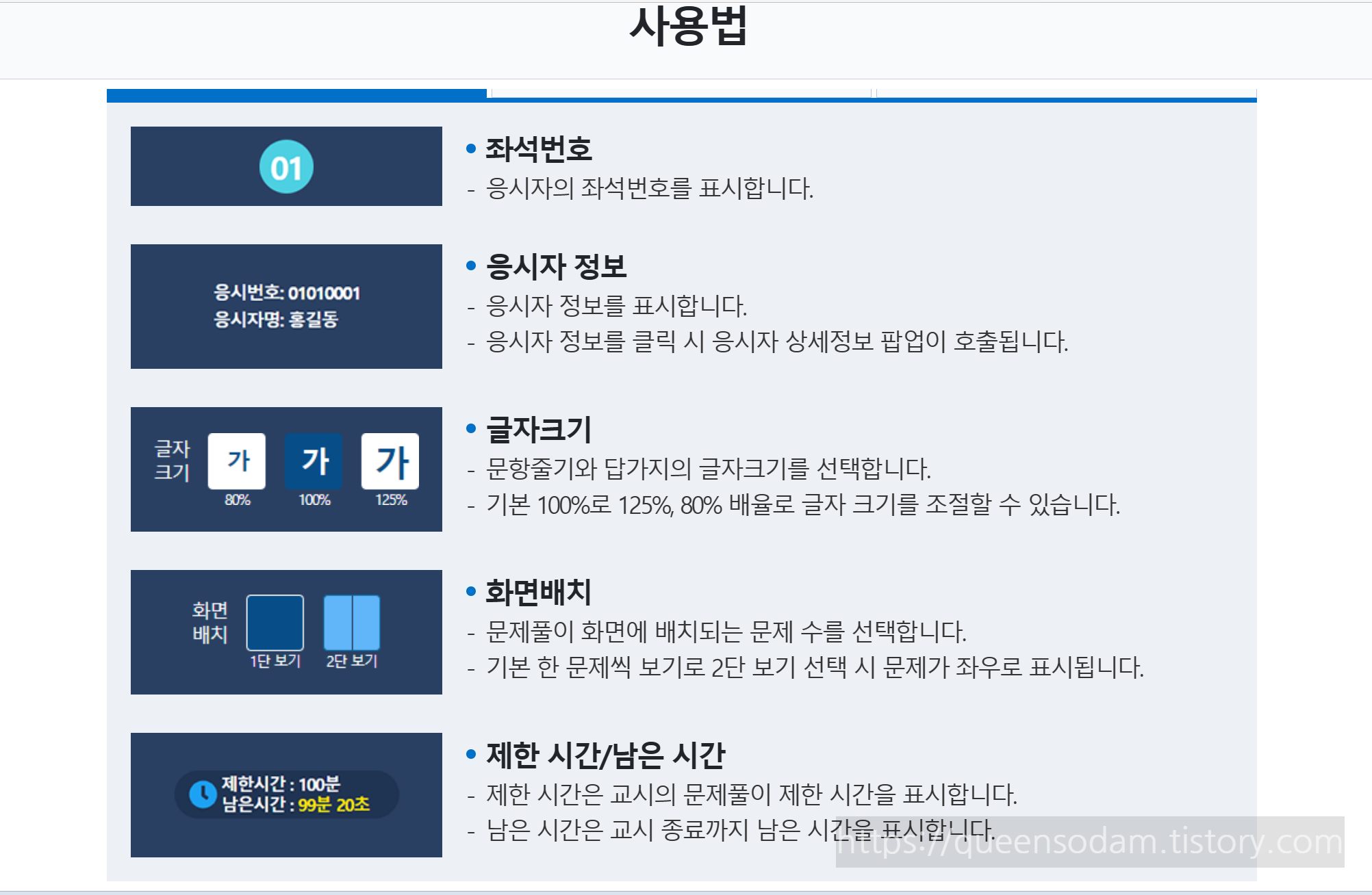 좌석번호, 응시자 정보, 글자크기, 화면배치, 제한시간/남은 시간 화면에 표시됩니다.
