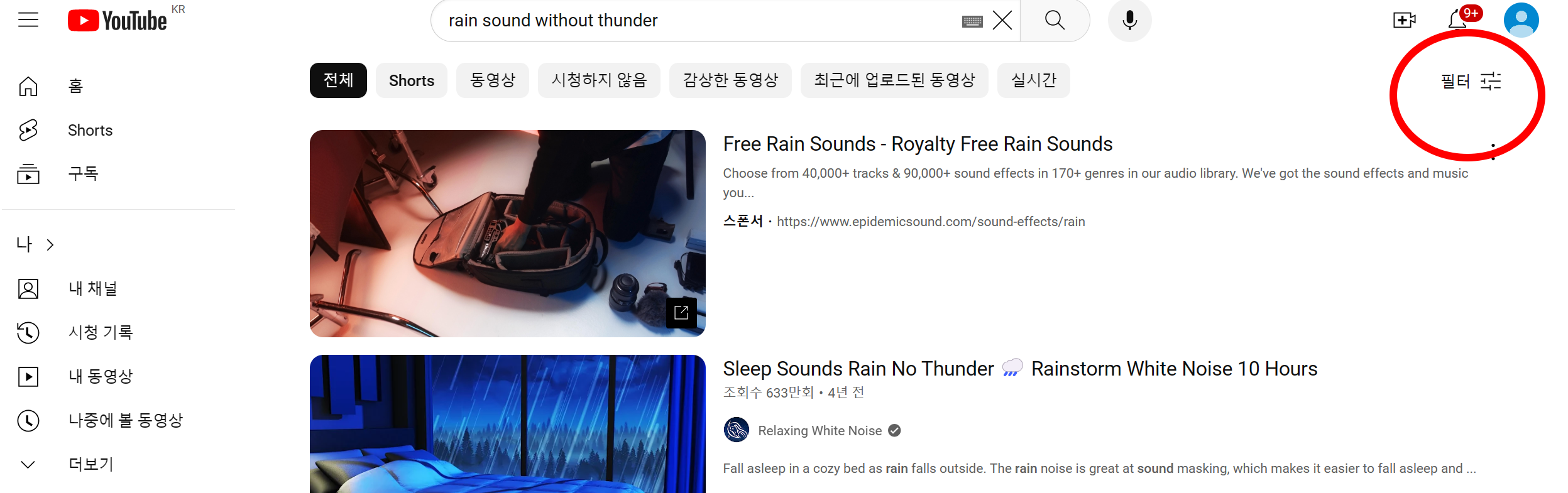 ▶유튜브에 빗소리라고 한글로 쳐도 되지만