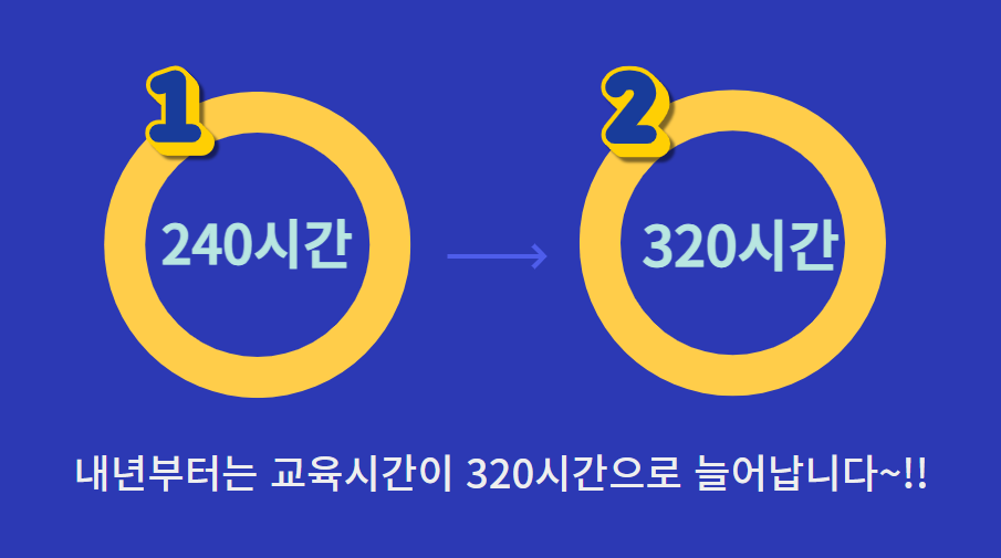 240시간 교육은 올해 2023년도 까지 유효하며 내년 2024년부터는 320시간으로 교육이수시간이 변경됩니다.